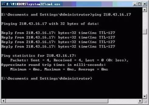 如图所示,使用ping命令检查到IP地址210.43.16.17的计算机的连通性,该例为连接正常。共发送了四个测试数据包,正确接收到四个数据包。