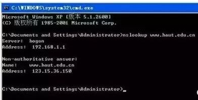 (2)查看www.haut.edu.cn的IP。在提示符后输入要查询的IP地址或域名并回车即可。