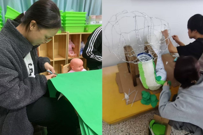 汇报展方案自教学周十四周筹备开始,得到学校领导的大力支持。方案前期,由任课老师在班级课堂中下发各项目任务,以传统文化为主题,在《学前儿童游戏与指导》课程中,每班学生分成三个小组,通过小组合作设计游戏方案,模拟幼儿园教师组织游园活动,最终完成项目一游园会主题活动;《幼儿园环境创设与玩教具设计》课程中,任课老师根据小组确定的游戏方案,指导学生以小组为单位,设计和制作游戏环境创设和游戏道具的制作。